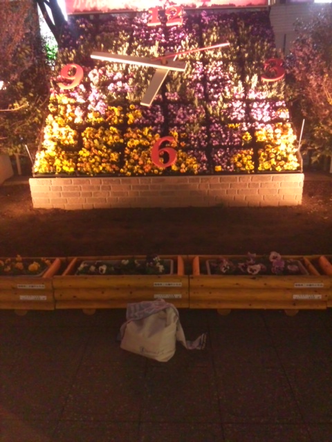 春をまつ福島駅花時計で福島県、南相馬の復興を祈る日体柔整バック、マフラータオル
